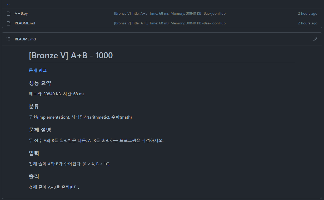 해결한 문제들의 가장 마지막 submit을 github에 자동으로 push 해주며, 문제에 대한 설명과 해결한 코드의 성능을 요약해 준다.
